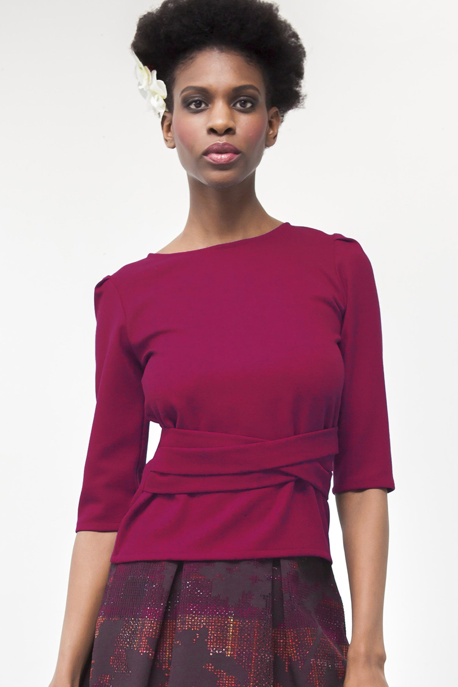 Pretty knitted top with 3/4 sleeves with a small pleat on the shoulder. Belted with 3 bands to emphasize the waist. We love it for its stretch material that is very pleasant to wear and its very soft touch. You will love wearing it with jeans or more dressed up with a skirt.