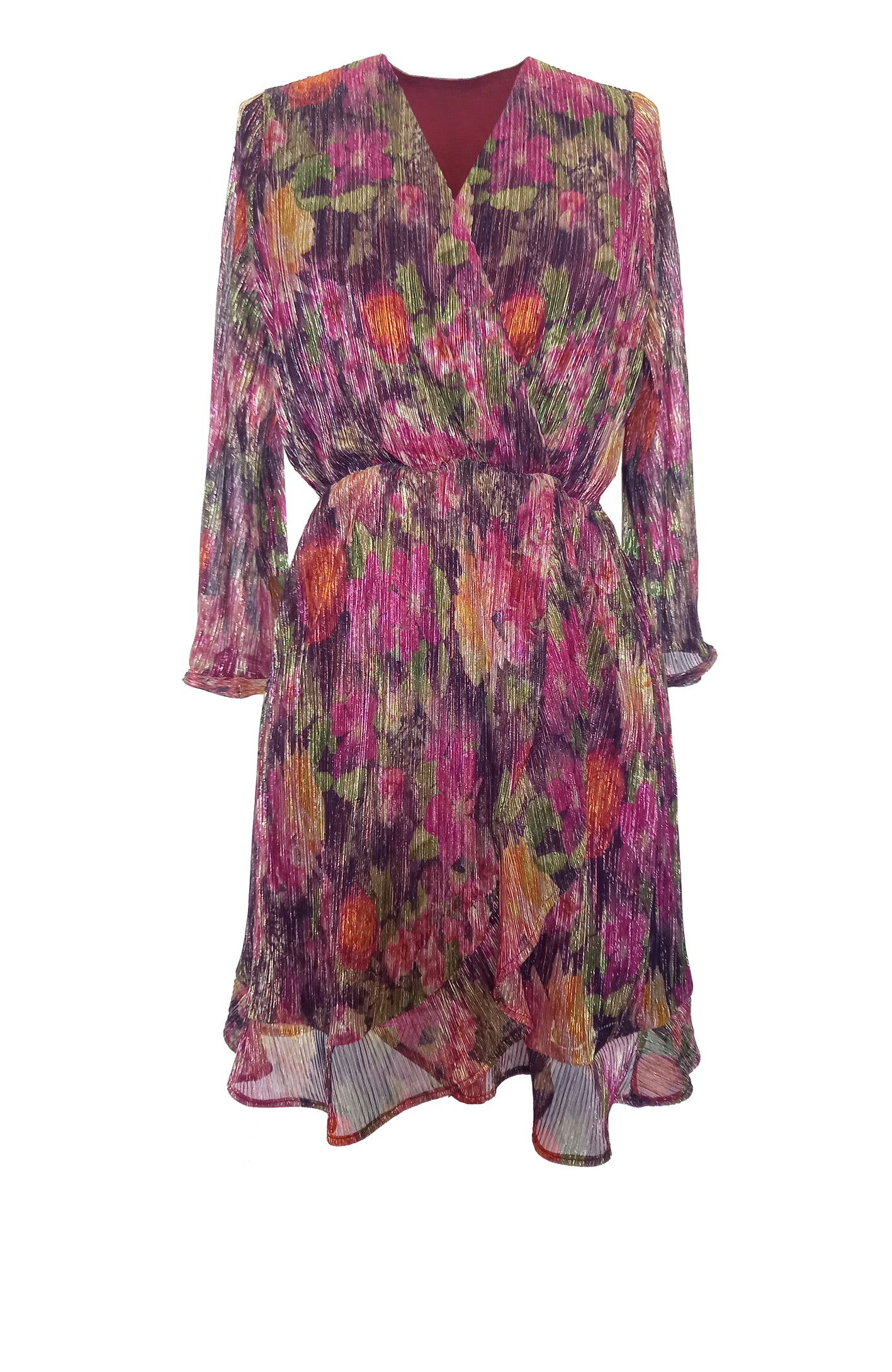 • Robe croisée ICONIC tequila, plissé imprimé violet, rose fushia et vert et fil métallisé pour femme