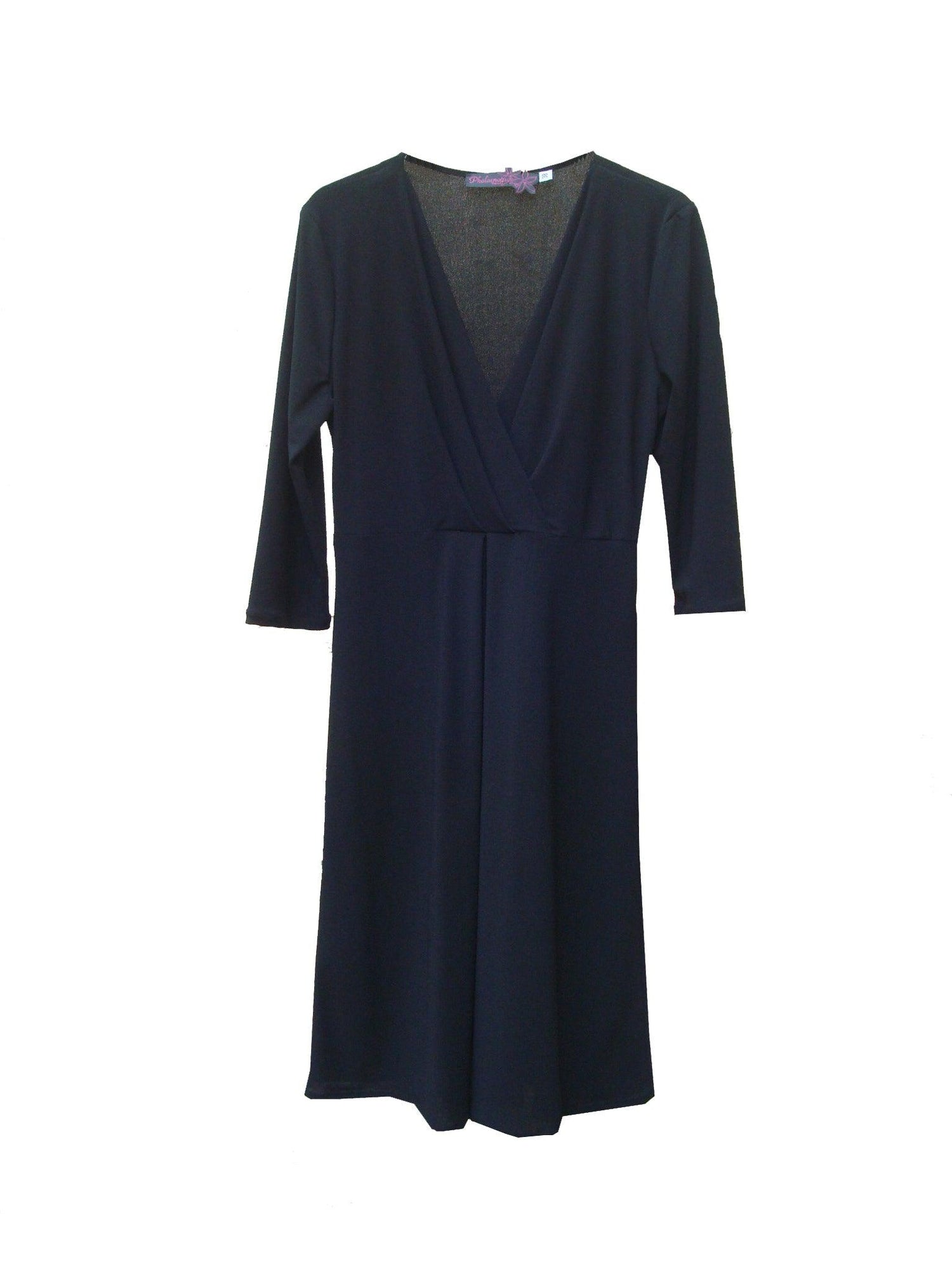 Fall for this pretty crepe mesh dress with 3/4 sleeves. Its stretch material is so comfortable. A pretty crossover neckline , its flared skirt with hollow pleats in the middle hides small curves! Knee length.