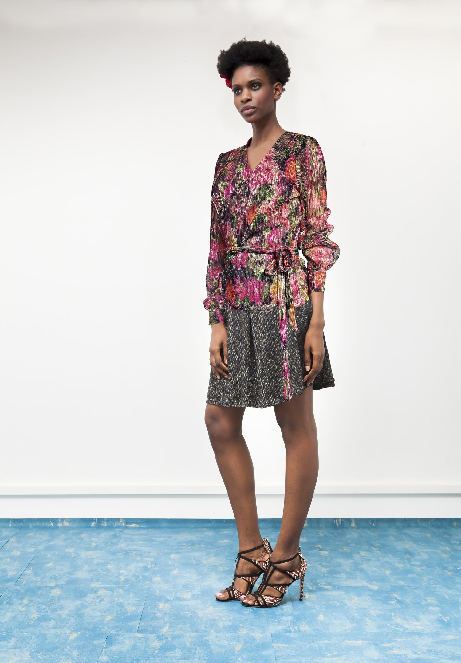 • Cache-coeur NORA tequila pour femme, plissé imprimé violet, rose fushia et vert et fil métallisé
