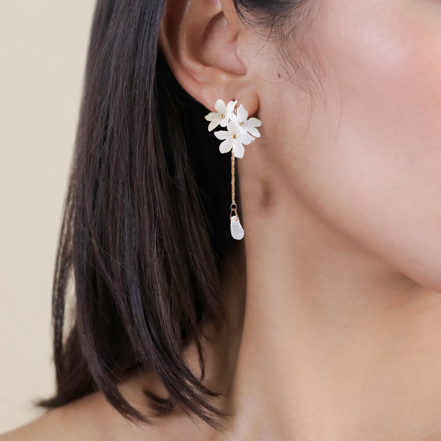 Boucles GOUTTES et petites fleurs - Phalaenopsis Paris - Boucles d'oreilles pendantes dorées à fleurs blanches; cadeau fête des mères