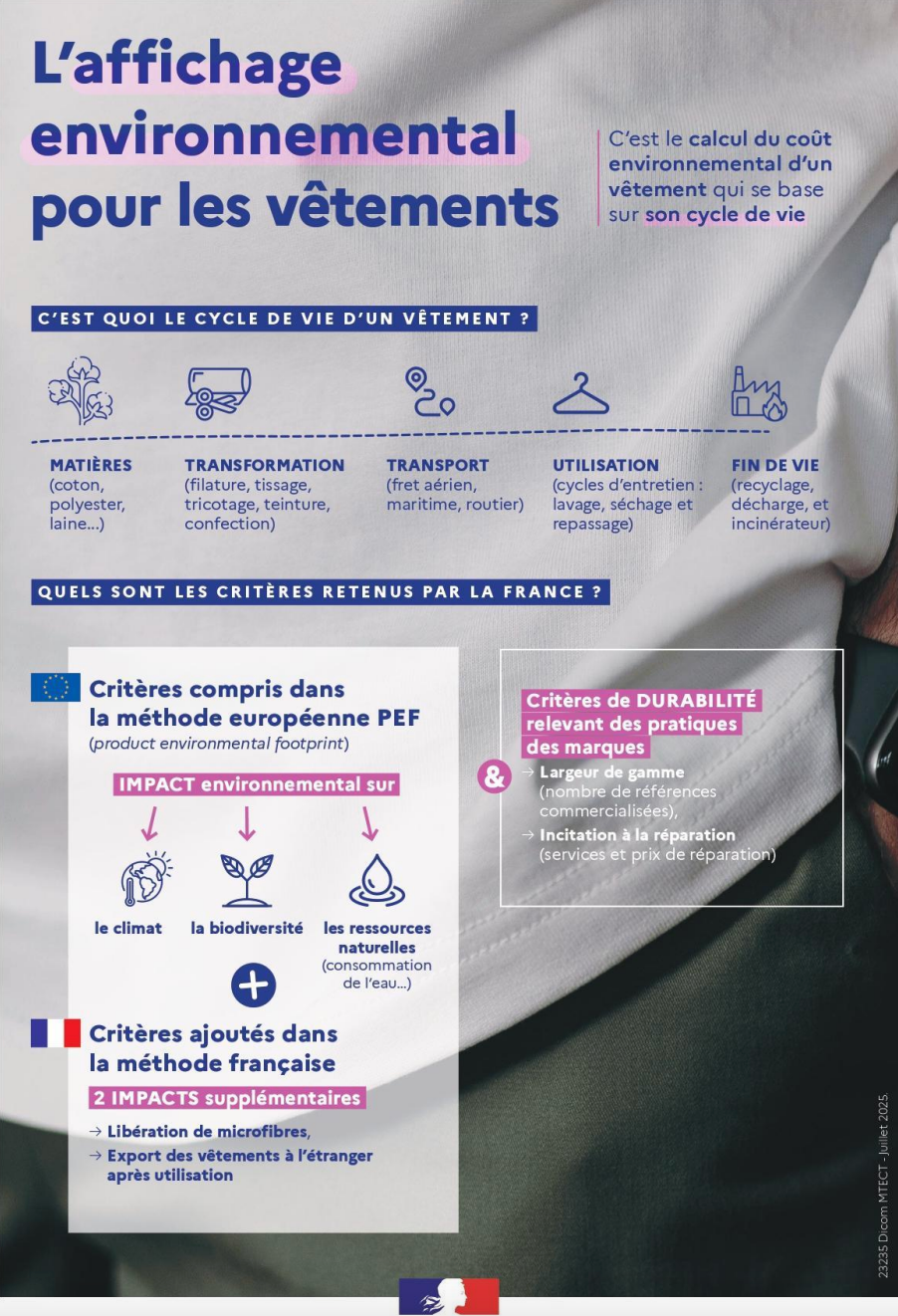 L’affichage repose sur une analyse complète du cycle de vie du produit : de la culture des matières premières à la fin de vie, en passant par le tissage, la teinture, la confection, le transport, et l’entretien.