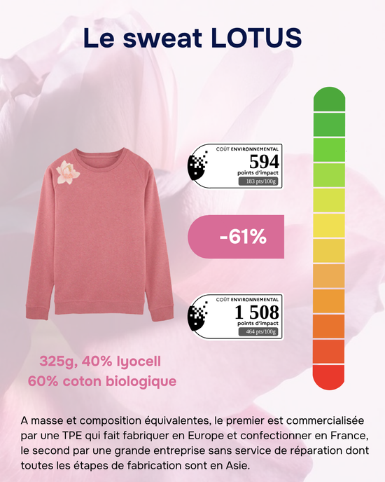 Ce chiffre, calculé selon une méthode scientifique, traduit les impacts cumulés du vêtement tout au long de son cycle de vie : de la fibre à la fin de vie.