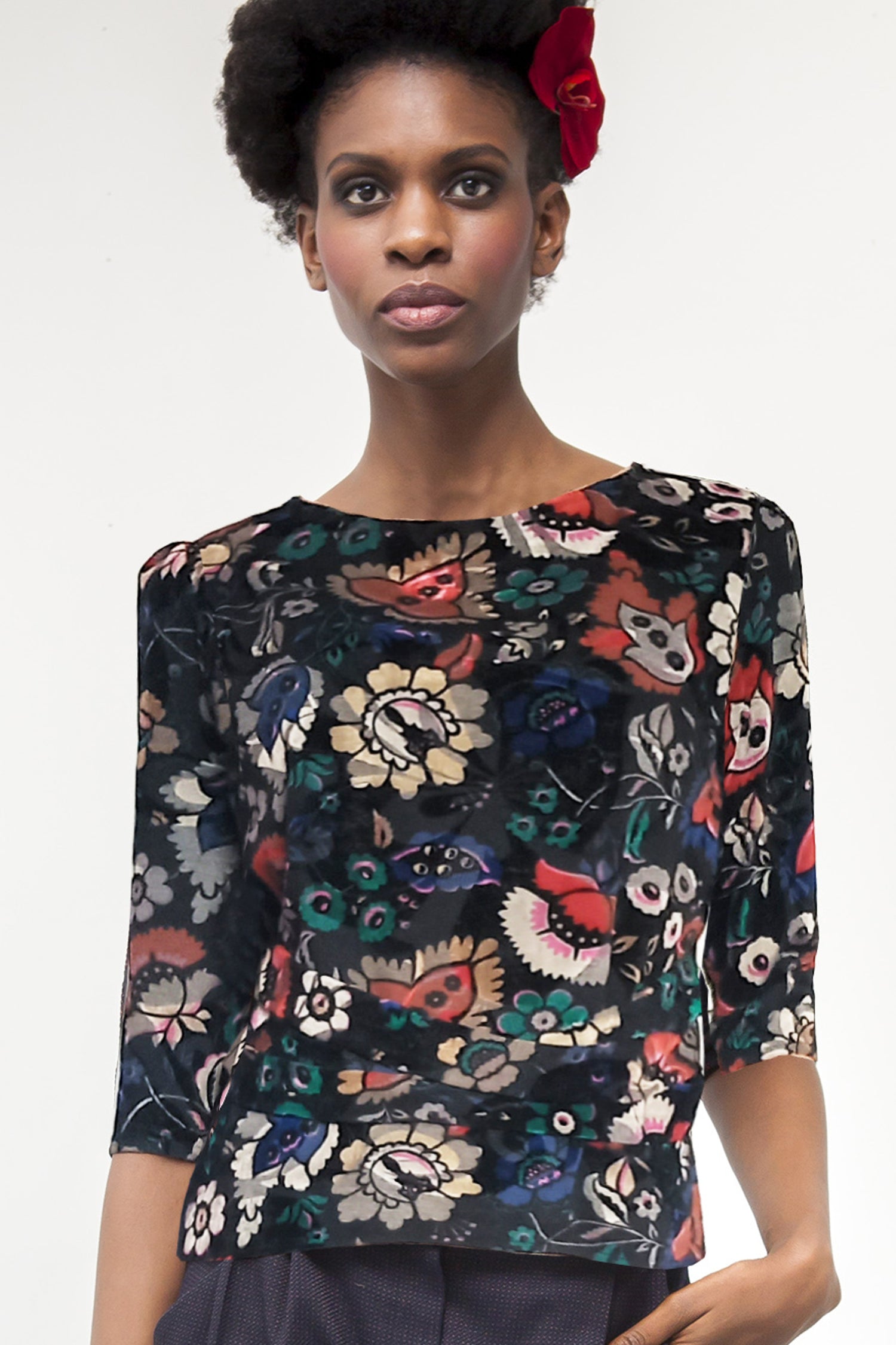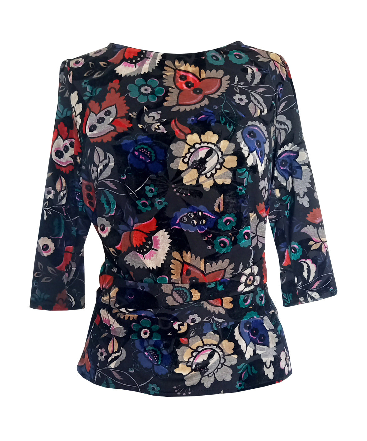 Joli top en maille velours imprimé certifié Oeko-Tex®. Manches 3/4 avec un petit pli sur l'épaule. Ceinturé de 3 bandes pour souligner la taille. Zip invisible dans le dos. On l’aime pour sa matière stretch très agréable à porter et son toucher tout doux. Vous allez adorer le porter avec un jean ou avec notre pantacourt Bali.